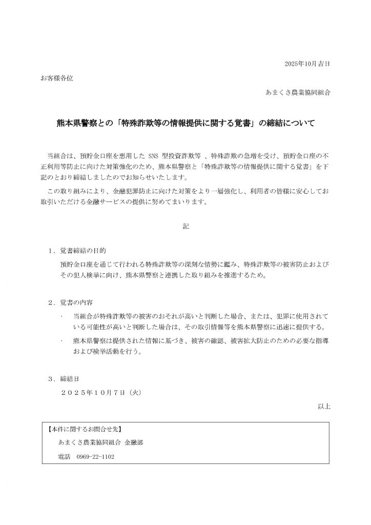 熊本県警察との「特殊詐欺等の情報提供に関する覚書」の締結について