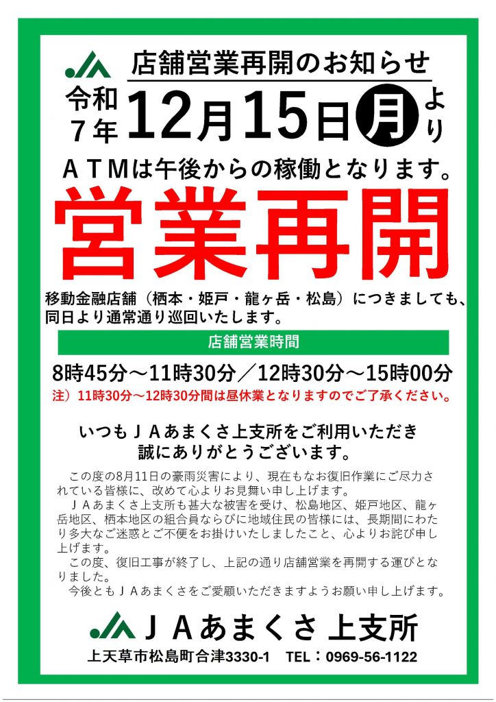 JAあまくさ上支所営業再開のお知らせ